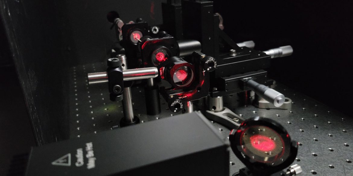 Photo Description: The “light trap” setup is shown, consisting of a partially transparent mirror, a thin, weak absorber, two converging lenses and a totally reflecting mirror. Normally, most of the incident light beam would be reflected. However, due to precisely calculated interference effects, the incident light beam interferes with the light beam reflected back between the mirrors, so that the reflected light beam is ultimately completely extinguished. The energy of the light is completely sucked up by the thin and weak absorber.