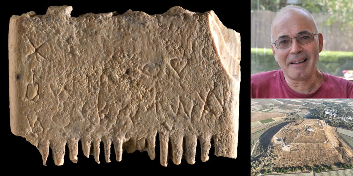 Clockwise from left: comb inscribed with “may this [ivory] tusk root out the lice of the hair and the beard”, Prof Yosef Garfinkel and Tel Laschish, where the comb was unearthed.