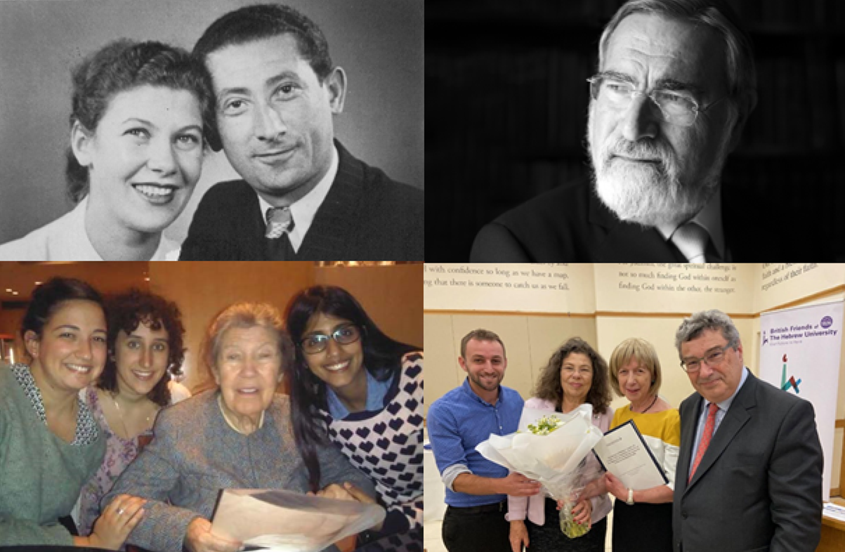 Above left: Yeheskel and Batya Sieratzki z”l; Below left: Batya Sieratzki z”l with Revivim students Shira Doctorman, Meytal Blumenthal, and Dikla Hodefi; Above right: Rabbi Lord Jonathan Sacks zt”l Below right: Chananya Rothner, Luba Selzer (nee Sieratzki), Lady Sacks, Dr. Harry Sieratzki
