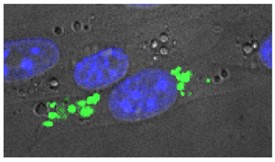Description: Human pancreatic cancer cells harboring intracellular P. gingivalis (bacteria labeled in green and nucleus in blue)