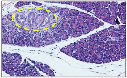 Description: Pancreas sections from control and P. gingivalis-infected mice. Control mouse showing a small pre-cancerous lesion (marked in yellow)
