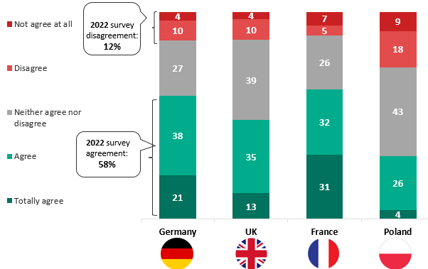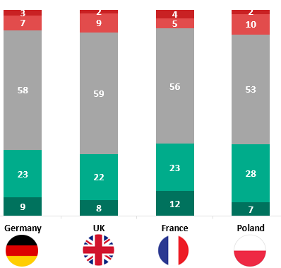 Antisemitism Perception: France (63%) and Germany (59%) perceive antisemitism as a significant issue, followed by Great Britain (48%) and Poland (30%).