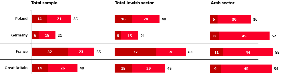 The survey was prepared by Prof. Gisela Dachs from the Hebrew University. It was conducted in Israel, Germany, United Kingdom, France and Poland via the internet between February-March 2024 with a total of 1,000 men and women from each country constituting a nationally representative sample of the adult population aged 18 and over. The maximum sampling error was 3.1% at a confidence level of 95%. The online surveys were carried out by Kantar.