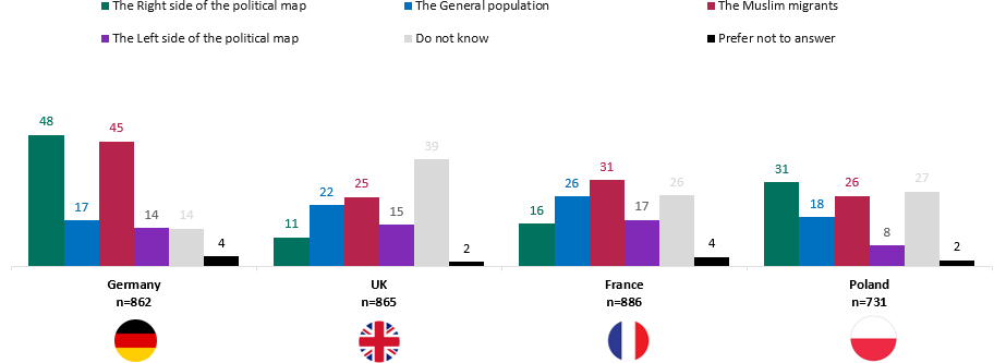 Threat Sources: When examining the sources of Antisemitism, opinions on the sources vary among and within different European populations. German respondents identify the far right (48%) and Muslim migrants (45%) as primary contributors. In Britain, 39% expressed uncertainty, while 25% attributed it to Muslim migrants. French respondents largely attribute it to Muslim migrants (31%), with 26% either uncertain or attributing it to the general population. In Poland, 31% implicate the far right, 27% are uncertain, and 26% identify Muslim immigrants as the source.