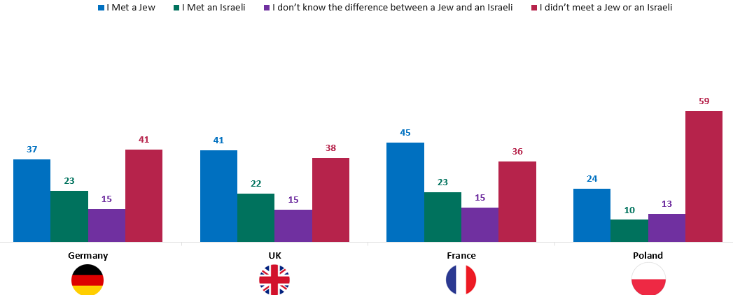 Lack of Personal Interaction: 59% of Polish and 41% of German respondents have never met a Jew or Israeli, with older Germans (47%) and younger Poles (63%) comprising the majority.