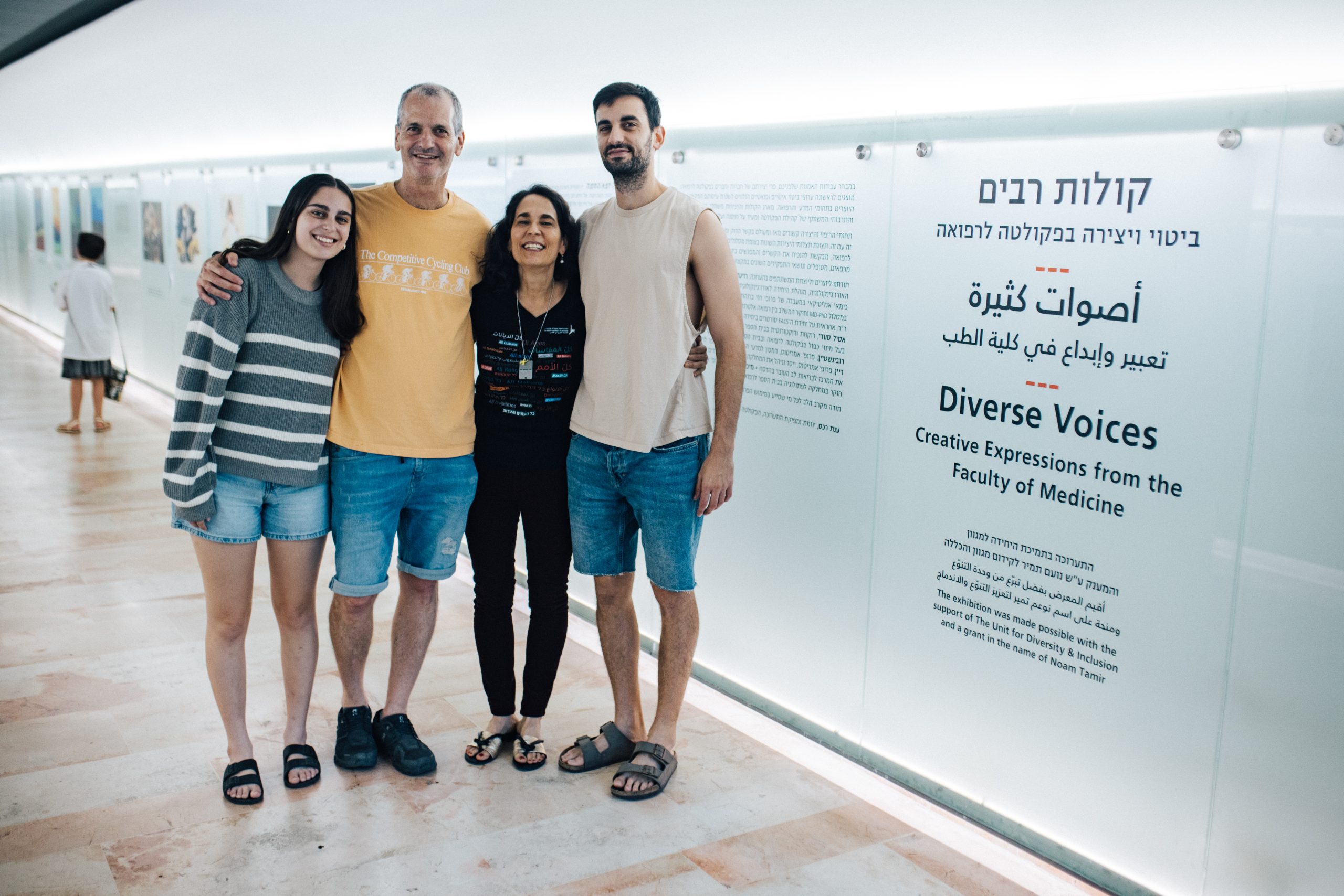 Amid ongoing conflict, the academic year, which started significantly late, ended in mid-July, but not before the exhibition’s opening, which was attended by over 150 guests, including the Dean of the Faculty of Medicine, Professor Eli Pikarsky, the University’s Vice President for Strategy and Diversity, Professor Mona Khoury, the artists, their families and many students and staff members who came to support their colleagues. “I’m excited because it turned out just as I imagined,” Anat said in an interview with BFHU. “Hundreds to thousands of people pass through this tunnel every day, including students, faculty, doctors and researchers. This is an eye-level exhibition; I see people stopping and looking and the fact that these are faculty members whom many visitors know fosters spontaneous conversations between the exhibition visitors and its creators. So far, I’ve received a lot of positive feedback and I’m sure that beyond the pride, it brings a sense of joy to the heart.”