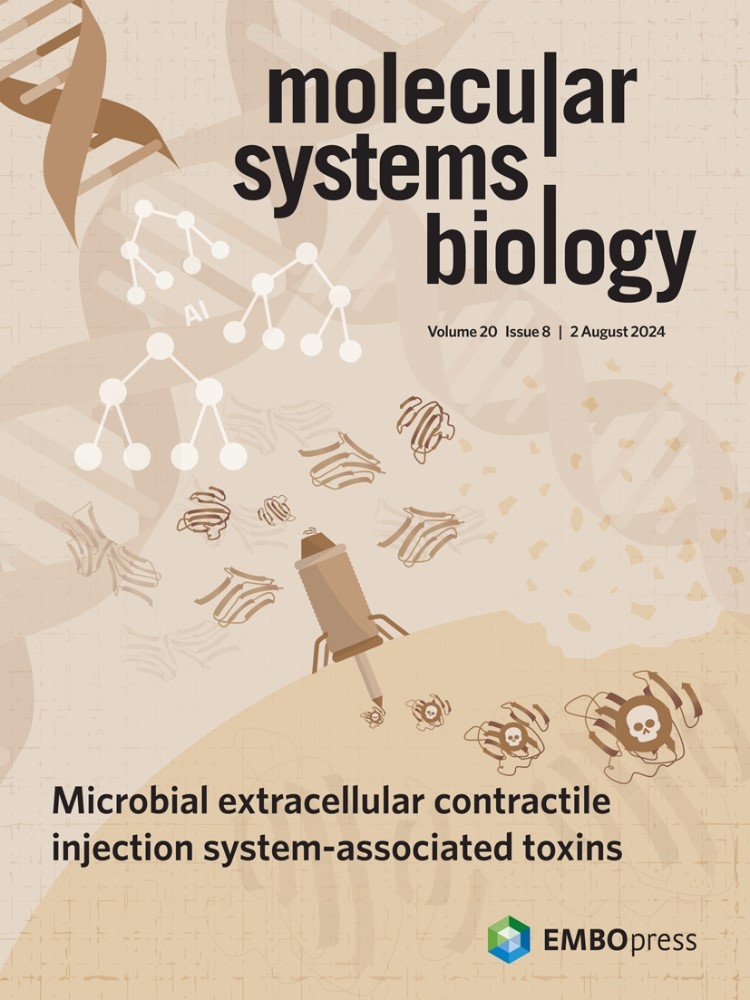 The cover of Molecular Systems Biology featuring eCIS injecting toxins that were predicted by AI. Artwork by Dr. Yitzhak Yadegari