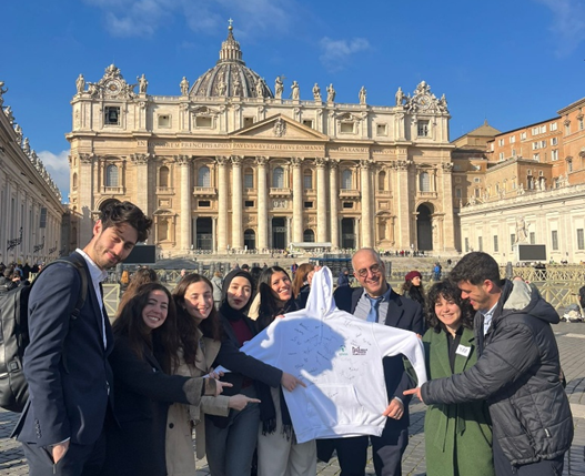 Below: Middle Meets in the Vatican – Holding a Sweatshirt Signed by Pope Francis and All Participants