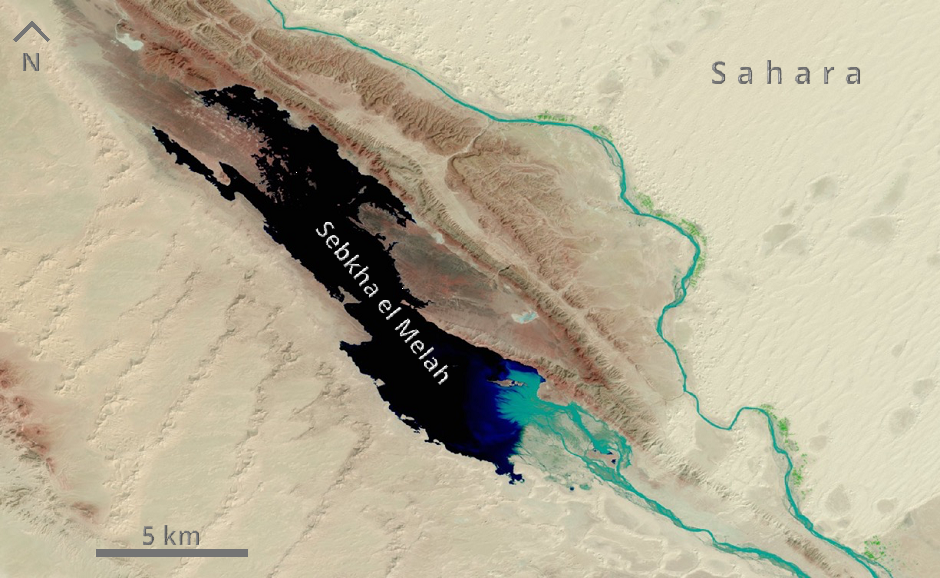 Caption: The normally dry northwestern Sahara lake, Sebkha el Melah, was filled for the seventh time since the beginning of the 21st century. This flood, in September 2024, which occurred after the study was conducted, happened because of heavy precipitation in the Sahara associated with the same atmospheric patterns described in the paper, in which Atlantic moisture is driven far into the desert. Landsat 9 imagery is from the NASA Worldview application (https://worldview.earthdata.nasa.gov), part of the NASA Earth Science Data and Information System (ESDIS).