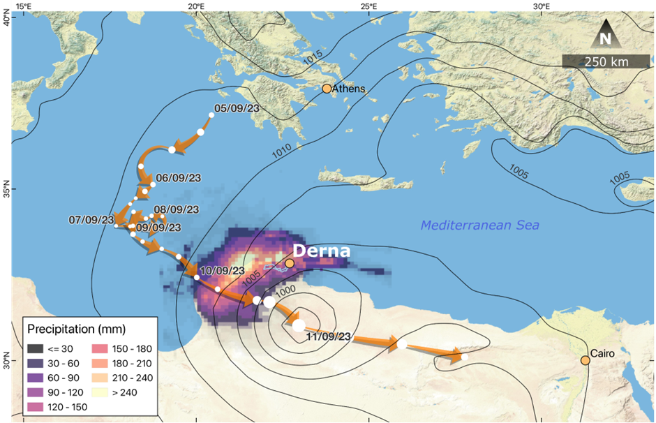 The track of Storm Daniel across the Mediterranean Sea and the heavy rainfall it triggered in Libya. Dozens of mm of precipitation fell in the Wadi Derna catchment (blue line) which triggered the flood.