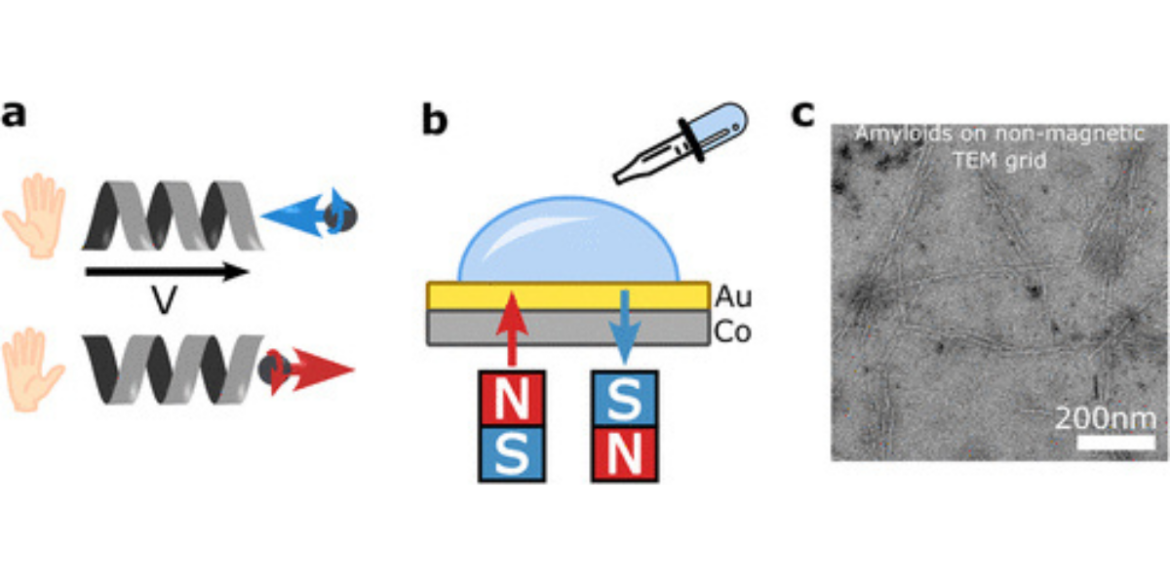 A new study reveals that the assembly of amyloid proteins—central to Alzheimer’s disease—can be strongly influenced by the spin orientation of electrons on magnetised surfaces. Researchers found that the direction of magnetisation, together with the protein’s molecular “handedness” (chirality), led to dramatic differences in the number, length, and structure of amyloid fibrils formed. The phenomenon points to a direct role for electron spin, under the mechanism of Chiral-Induced Spin Selectivity (CISS), in dictating how these disease-related proteins self-assemble—a physical factor that could open new routes to controlling or interrupting amyloid build-up in the brain.