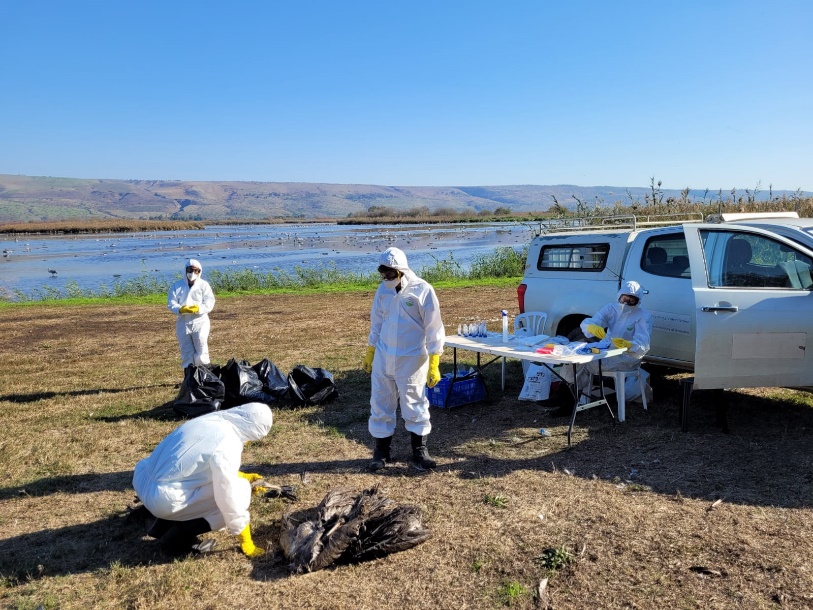 The Movement Ecology Lab team collects samples from dead cranes at Hula Lake during the peak of the avian influenza outbreak, December 27, 2021 (Credit – Hadas Kohner, Israel Nature and Parks Authority)