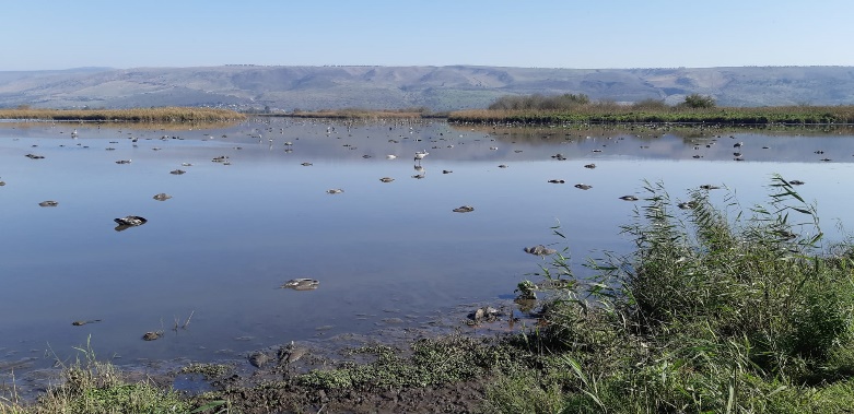 Thousands of dying and dead cranes scattered across Hula Lake during the peak of the avian influenza outbreak, December 27, 2021. (Credit – Prof. Ran Nathan, The Hebrew University of Jerusalem)