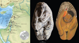 Left: Map of the Levant showing the location of Nahal Ein Gev II (NEGII) among Natufian sites; Right: The 12,000-year-old Natufian clay figurine from Nahal Ein Gev II, depicting a woman leaning forward and a goose enveloping her (accompanied by an artistic reconstruction):