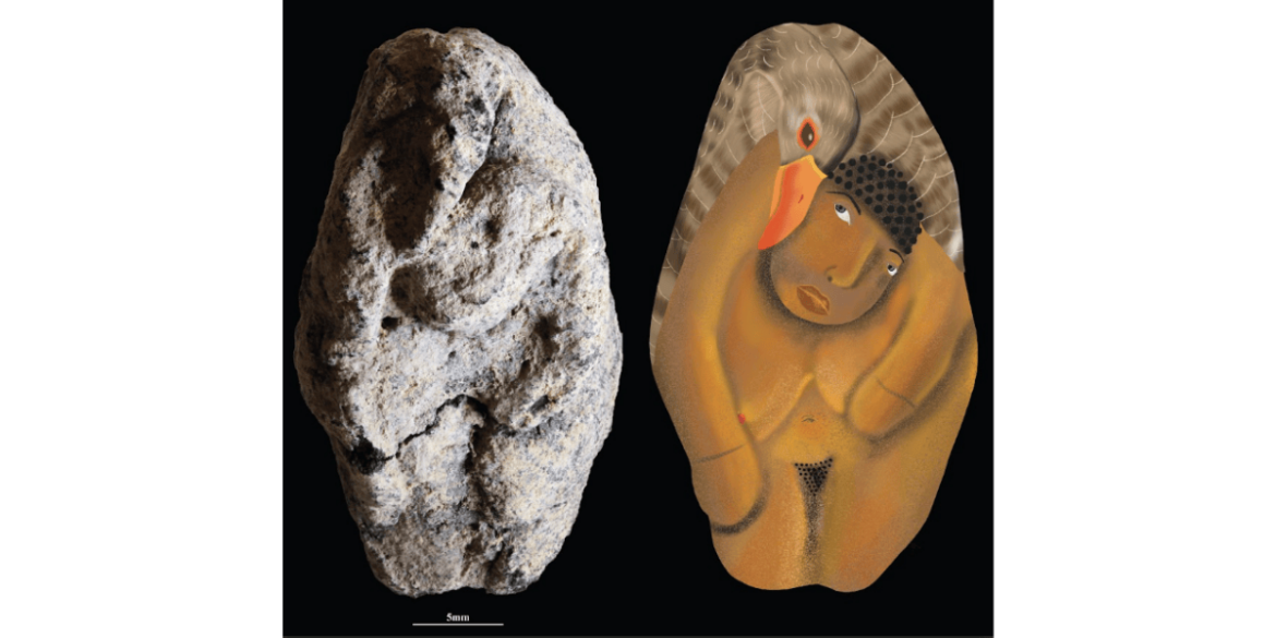 Title Image: The 12,000-year-old Natufian clay figurine from Nahal Ein Gev II, depicting a woman leaning forward and a goose enveloping her (accompanied by an artistic reconstruction); Credit: Laurent Davin