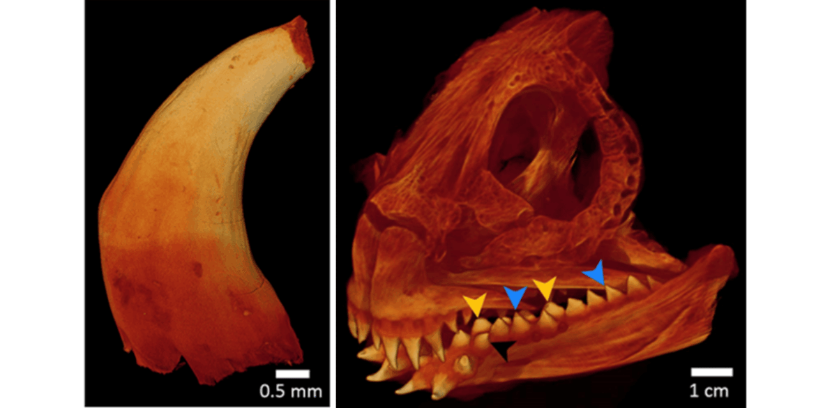 The secret appears to lie in osteodentin’s microscopic structure: a very dense network of vertically oriented canals of 10-20 microns in diameter, that runs from the base of the tooth to its top, and curve outward near the tooth surface. The team suggests that this architecture causes the mineralized columns between canals to bend inward under pressure, creating a natural mechanism that increases toughness and helps prevent cracking.