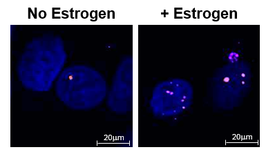 Caption: The figure shows breast cancer cells after treatment with estrogen, which activates certain types of super-enhancers, marked with gammaH2AX, a marker for DNA damage. The field on the left shows untreated cells with little or no signs of DNA damage. Credit: Osama Hidmi