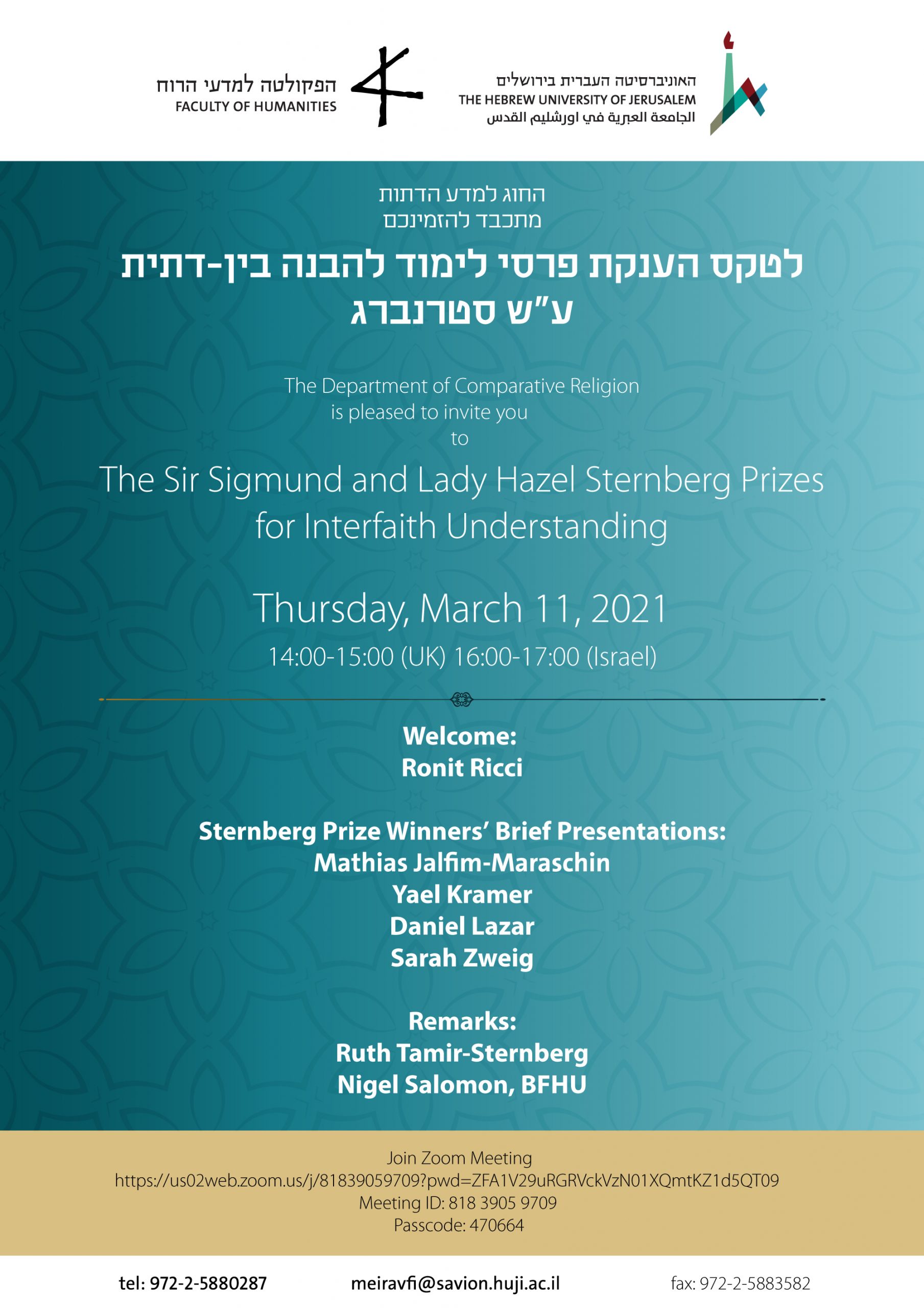 Sternberg Prizes in Interfaith UnderstandingEvent Details When Thu 11th Mar 2021 @ 2:00pm - 3:00pm Where Zoom Ticket Price FREEBack to Events ListHome>Events>Sternberg Prizes in Interfaith UnderstandingSternberg Prizes in Interfaith UnderstandingBuy Tickets*If you would like to add multiple ticket types, repeat the steps below for each type and click continue hereStep 1. Choose a ticket type FREEFREEStep 2. Choose number of tickets Sternberg Prizes in Interfaith Understanding quantity Step 3. Add ticket details Sternberg Prizes in Interfaith Understanding quantity Continue Here or DONATE Missed the Event? Click Here to watch (Password: u.7=sL!4) Category: Events